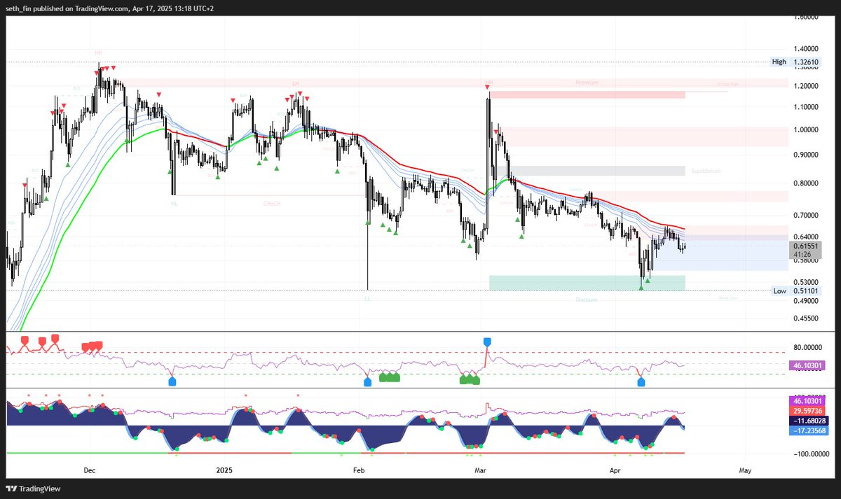 O preço da Cardano está mostrando sinais promissores, atualmente valendo $0,6153. Crypto Seth, um analista de criptomoedas, destacou que ADA encontrou suporte em um preenchimento de pavio recente, formando uma potencial baixa mais alta no gráfico de 12 horas. Um nível chave de resistência-transformado-em-suporte em torno de $0,60 está sob teste, e um fechamento de vela de 4 horas acima de $0,67 poderia sinalizar uma mudança de alta.