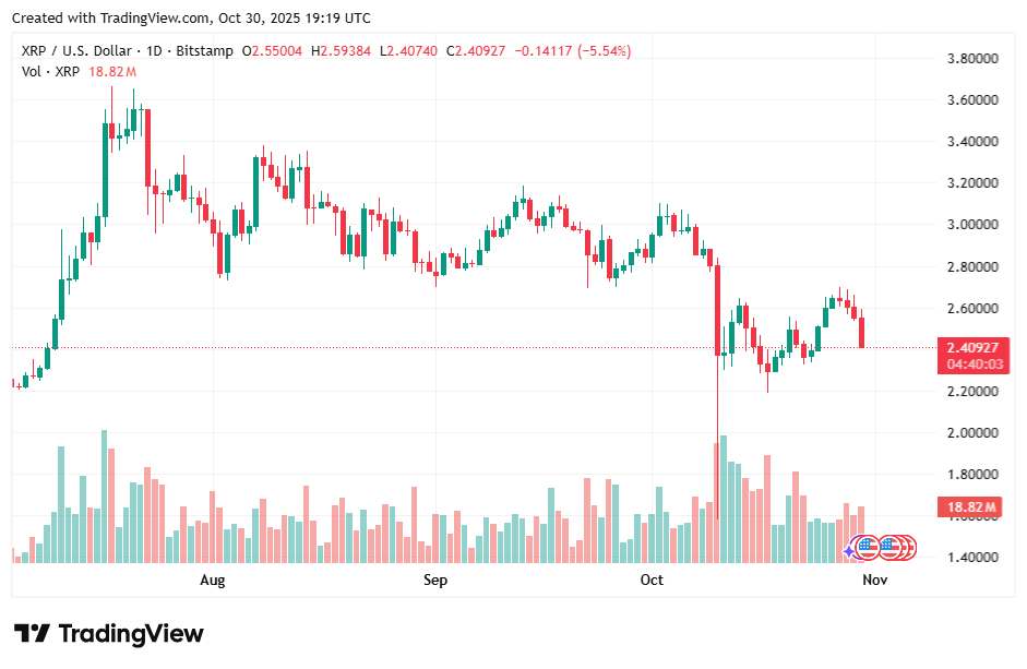 O mercado cripto volta a apresentar sinais de volatilidade renovada. O XRP mantém-se firme acima da faixa dos US$ 2,40, mesmo com a desaceleração da tendência mais ampla.
