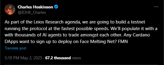 Cardano lançou uma nova testnet de IA chamada “Face Melting Net”, uma parte essencial de seu plano Leios Research. Liderado pelo fundador Charles Hoskinson, este projeto irá implementar milhares de agentes autônomos de IA em um ambiente blockchain ao vivo. O objetivo é testar quão bem a rede Cardano lida com desempenho, automação e velocidade. Este esforço levará a infraestrutura do Cardano aos seus limites, preparando o caminho para testes de aplicativos descentralizados de alto volume e expandindo seu papel em serviços impulsionados por IA.