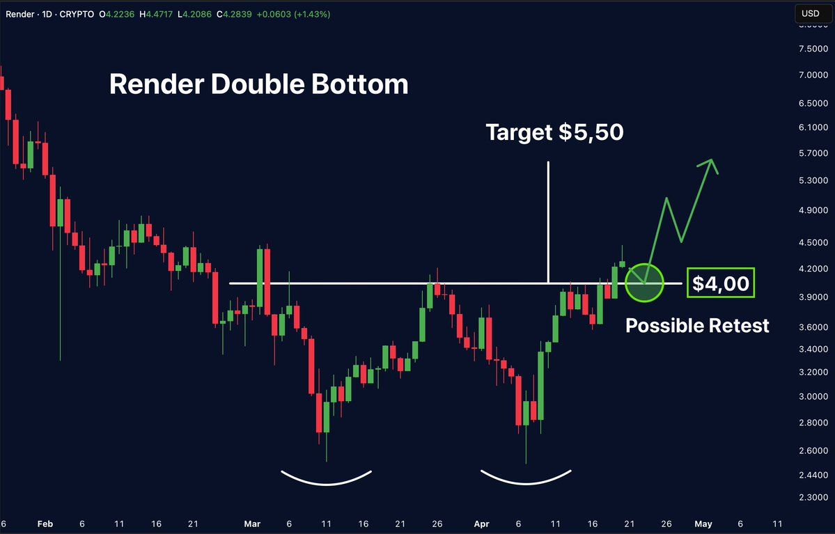 Tecnicamente, o momentum também tem aumentado, analistas observam que a RENDER recentemente confirmou um padrão de fundo duplo, frequentemente visto como um forte sinal de sentimento positivo do mercado. Com atenção crescente na infraestrutura descentralizada, a Render se destaca como um projeto a ser observado de perto na categoria abaixo de $10.