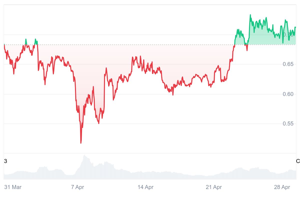 Na última semana, Cardano viu um aumento de preço de 13%. Também formou uma “cruz dourada”, indicando que o preço pode subir ainda mais. O volume de negociação diário de ADA aumentou 55% para $900 milhões, indicando confiança crescente no mercado. O próximo nível de resistência importante da altcoin é em $0,7289. Se quebrar esse nível, poderia se mover em direção a $0,76.