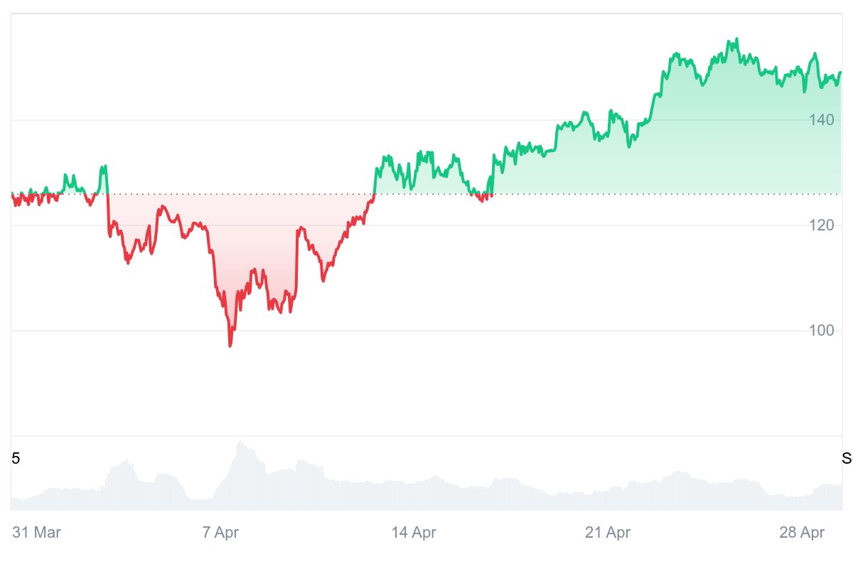 Solana aumentou seu preço em 8% na última semana. Está a caminho de superar o principal nível de resistência em $153,65. Solana está criando um padrão de xícara e alça que indicou ainda mais valorização no preço no passado.