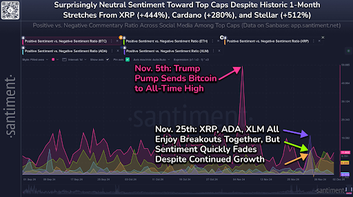 Nos últimos 30 dias, o Stellar (XLM) liderou o crescimento com um impressionante aumento de 512%, seguido pelo XRP com 444% e Cardano com 280%. Apesar desses aumentos, a análise mais recente do mercado pela Santiment aponta para a possibilidade de um crescimento ainda maior.