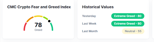 Outro indicador importante que apoia o sentimento positivo é o Índice de Medo e Ganância Cripto. Após atingir 95 (“ganância extrema”) durante a ascensão do Bitcoin a $98K, o índice caiu para 78, sinalizando um nível mais saudável de “ganância”. Essa queda, juntamente com a força atual do Bitcoin em $96K, sugere um ambiente de mercado mais equilibrado, reduzindo a probabilidade de uma correção abrupta.