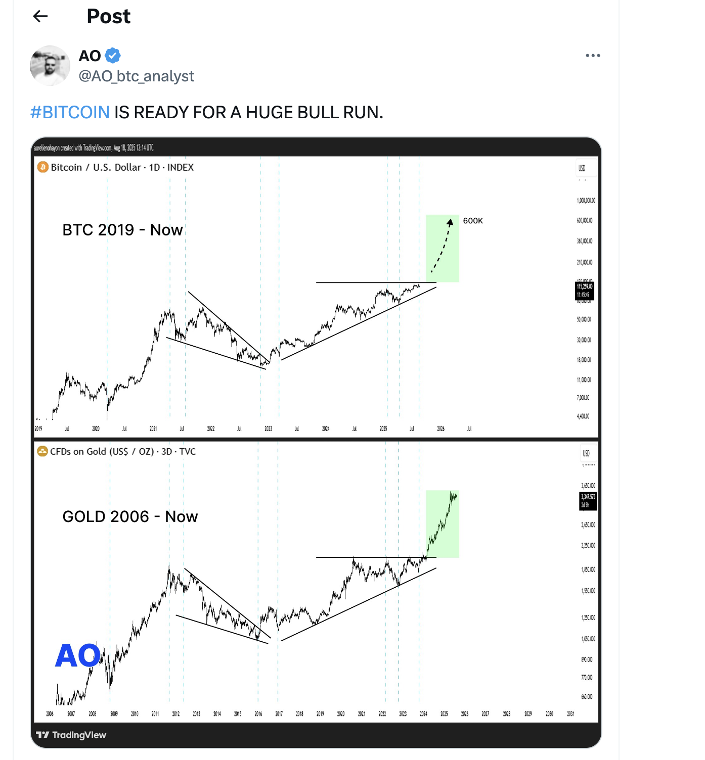 O analista bem conhecido AO comparou o gráfico do Bitcoin à trajetória do ouro entre 2006 e 2020, observando semelhanças impressionantes. O ouro se consolidou dentro de uma cunha e triângulo ascendente antes de seu eventual surto para recordes históricos. Se Bitcoin espelhar esta estrutura, pode estar no caminho para $600.000 até 2026.