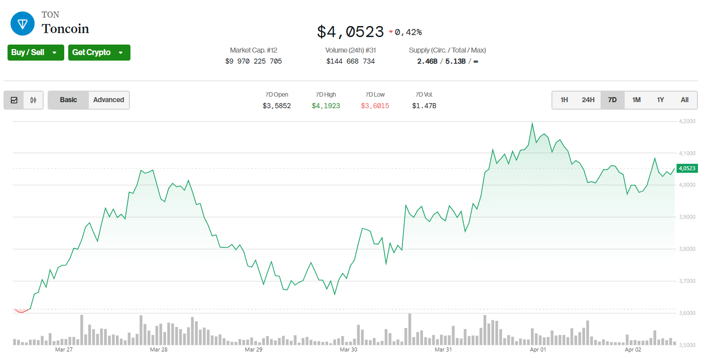 - Nova Máxima Mensal: O preço do Toncoin subiu para uma nova máxima mensal de US$ 4.20, refletindo o sentimento positivo do mercado.