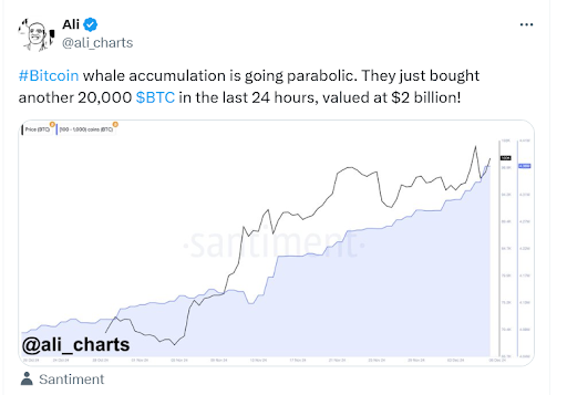 Dados recentes mostram que as baleias das criptos adquiriram 20.000 BTC em um único dia, de acordo com o analista Ali Martinez. Essa compra em grande escala indica uma nova fase de acumulação do Bitcoin, com grandes players se posicionando para movimentos de preço a longo prazo.