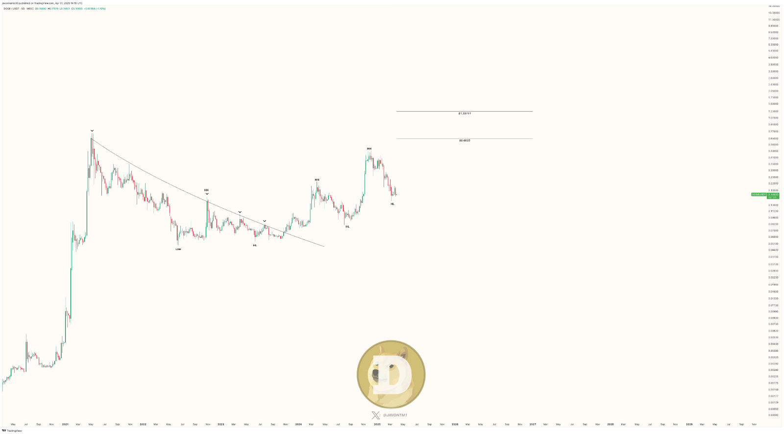 Muitos agora esperam que o DOGE alcance a zona de $0,65. Isso significaria um salto de mais de +270% a partir do preço atual. Alguns estão indo ainda mais longe, falando sobre um rally até $5. Eles baseiam isso em como o DOGE se moveu em ciclos anteriores — e os padrões agora parecem próximos daquelas configurações anteriores.