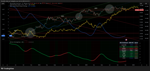 Historicamente, quando o dinheiro fica menos “fácil” ou mais “caro”, ativos de risco como o Bitcoin tendem a sofrer. Por conta dessa mudança no indicador, cresce a possibilidade de vermos uma correção de preço mais acentuada, talvez buscando aquela zona de liquidez nos $97 mil , ou, como alternativa, um mercado mais lateralizado e sem força compradora clara durante as próximas semanas, possivelmente até a metade ou o final de novembro, após o fim do shutdown americano.
