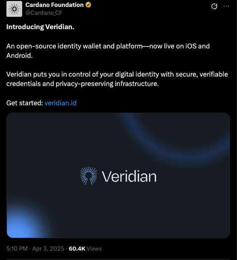 O lançamento do Veridian é uma mensagem clara. Cardano está construindo mais do que apenas ferramentas de contrato inteligente. Agora, está entrando em identidade digital, privacidade e uso real em grande escala.