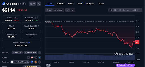 Chainlink tem sido uma escolha popular entre os detentores devido ao seu desempenho sólido ao longo do tempo. Atualmente, o preço do LINK está em $21,14, representando uma queda de 15,12% nas últimas 24 horas. Mesmo com essa redução, Chainlink mantém um valor de mercado de $13,24 bilhões. Existem 626,84 milhões de tokens LINK em circulação, tornando-a uma criptomoeda bem suportada.