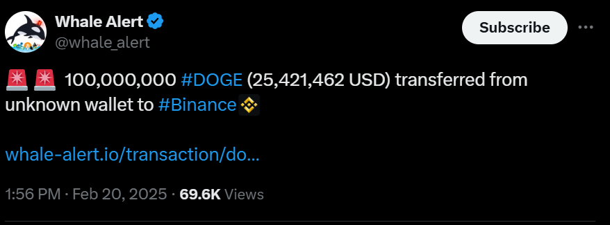 À luz das notícias recentes sobre criptomoedas, houve uma grande transação de cerca de 100 Milhões de Dogecoins, no valor de $25,4 milhões na Binance. O mais interessante é que a transação foi um depósito, indicando que os investidores estão mantendo Dogecoin.