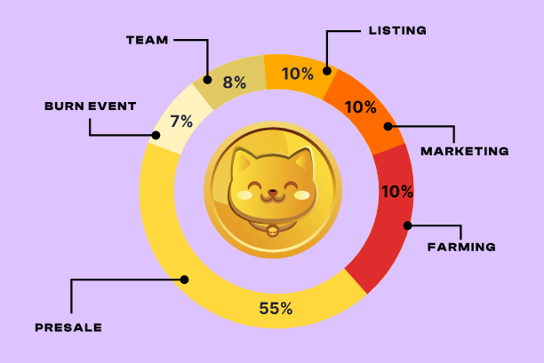 Atualmente avaliado em $0,045, Cutoshi tem um modelo de escassez integrado que está claramente definido em sua tokenomics. O projeto destinou 55% de seu fornecimento de 440 milhões para fases de pré-venda, enquanto o restante é distribuído em farming de tokens, mecanismo de queima de tokens, marketing, listagem e para a equipe.