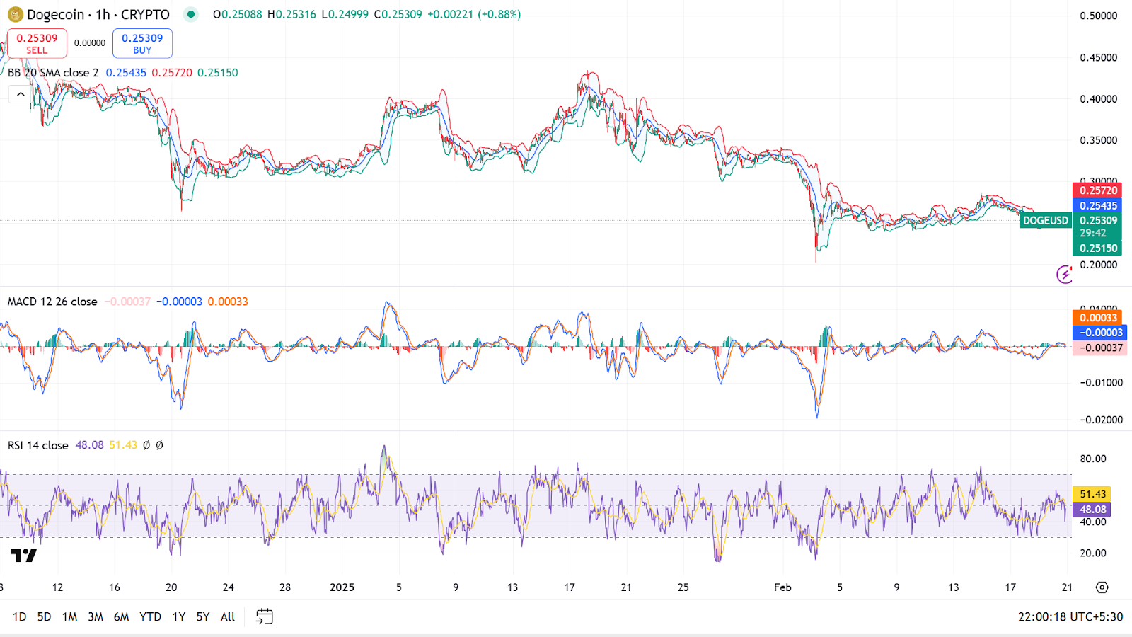 Dogecoin está em $0,25250 no momento da escrita, mostrando uma queda de 0,50% nas últimas 24 horas. Olhando para o gráfico, Dogecoin está próximo da banda inferior de Bollinger em $0,25150, mostrando potencial suporte para uma tendência de alta de curto prazo. No entanto, as linhas MACD e de sinal estão mais próximas de zero, indicando que Dogecoin terá uma reversão ou correção. Para completar, o RSI está em 51,43, que é a zona neutra.