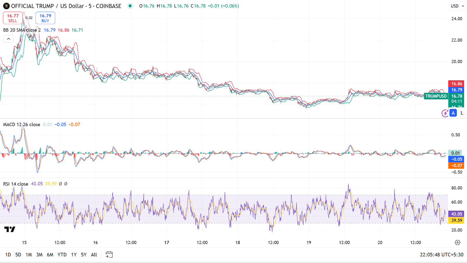 Estando em $16,78 no momento da escrita, TRUMP está mostrando um leve declínio de 1,95% com nível de suporte em $16,71 e resistência em $16,86. Como as bandas de Bollinger estão se contraindo e ficando mais estreitas com o tempo, isso indica que a natureza volátil do TRUMP está reduzida e há chance de uma alta em qualquer direção.