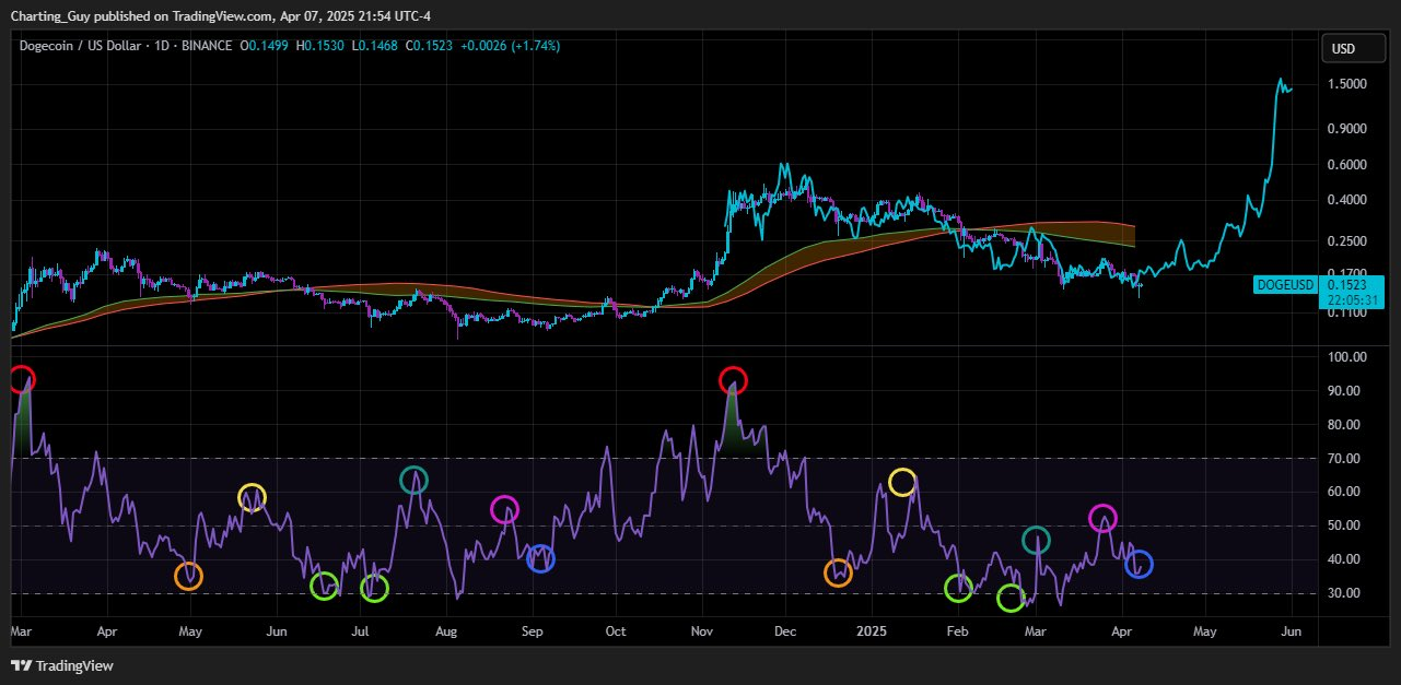 Apesar da queda, uma divergência de alta no RSI indica algumas chances de recuperação. Se DOGE se mantiver acima de 0,135 USDT, analistas esperam um possível reteste de resistência em torno de 0,18 a 0,20 USDT.