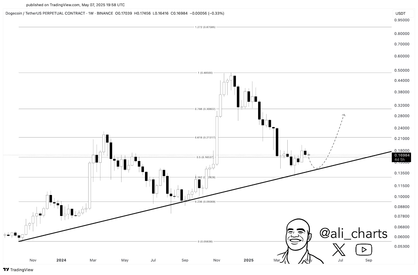 A ação de preço mais recente do DOGE aponta para uma continuação da tendência em direção a $0,60. De fato, Ali Martinez recentemente sugeriu que o preço do Dogecoin foi rejeitado a partir de uma linha de suporte de tendência de outubro de 2024. De acordo com o especialista em gráficos, uma queda para $0,14 poderia apresentar uma oportunidade de compra antes de um potencial rebote para $0,30.