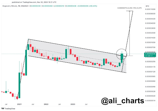 De acordo com Ali Charts, se o DOGE romper os $0,6859, pode rapidamente subir para $1,024, representando um aumento de 143%. Ali também prevê uma valorização massiva de 2.400% para o DOGE em relação ao Bitcoin, caso o padrão atual continue, tornando-o uma das principais apostas para grandes ganhos em dezembro.