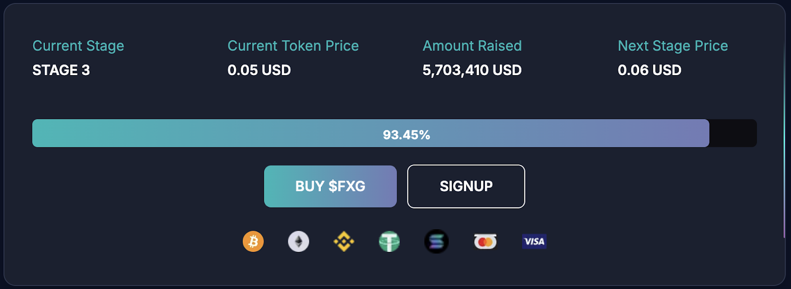 $FXG está agora no Estágio 3 de sua pré-venda cripto a apenas $0,05. E mais de 93% dos tokens já foram vendidos. Novos investidores têm a chance de garantir um ROI de 100% no lançamento. Na verdade, o preço do $FXG já subiu impressionantes 400% em relação ao preço da Rodada de Financiamento Seed de $0,01.