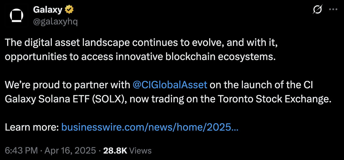 A Solana acabou de ganhar seu próprio ETF no Canadá. É chamado de Galaxy Solana ETF, que foi lançado pela CI Global e Galaxy Asset Management em 16 de abril de 2025.