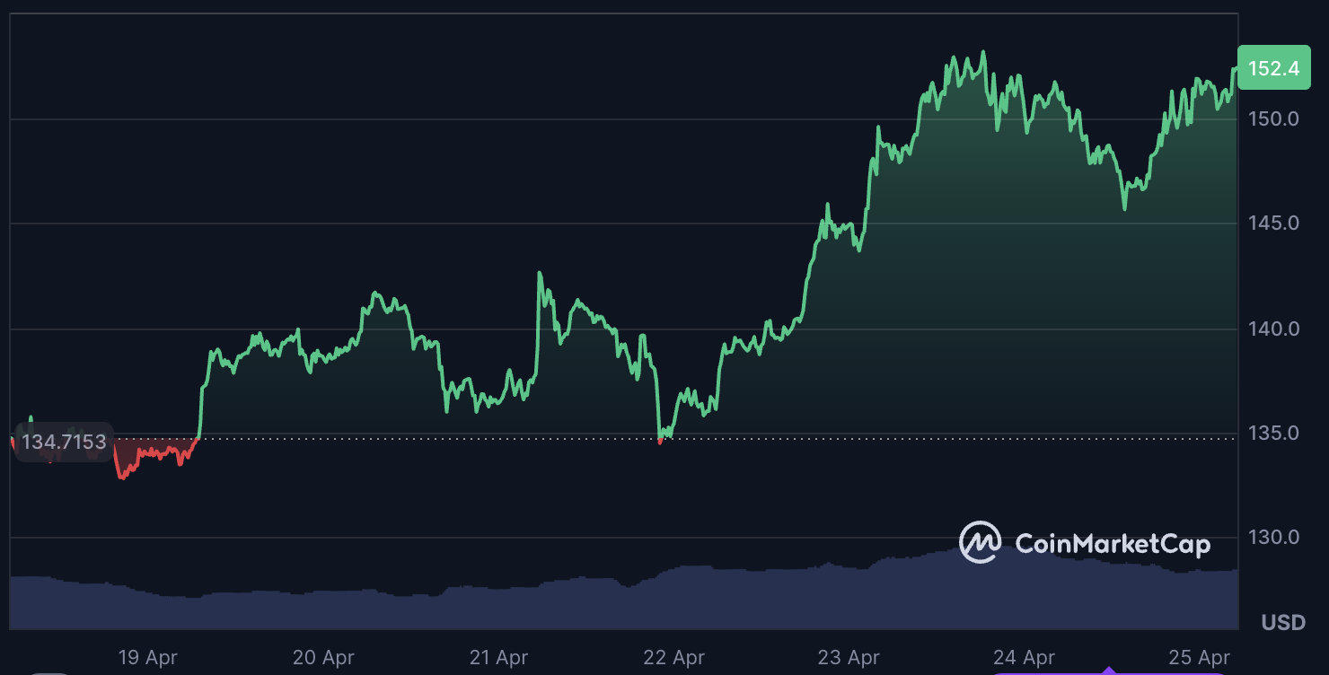 E embora isso possa parecer o tipo de coisa que deveria fazer o preço da SOL disparar, não é o caso. A SOL saltou de $123 para $153, mas até 24 de abril, recuou para $145 antes de se recuperar ligeiramente para $152. O hype ainda existe, mas está apenas alimentando a volatilidade.