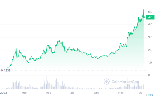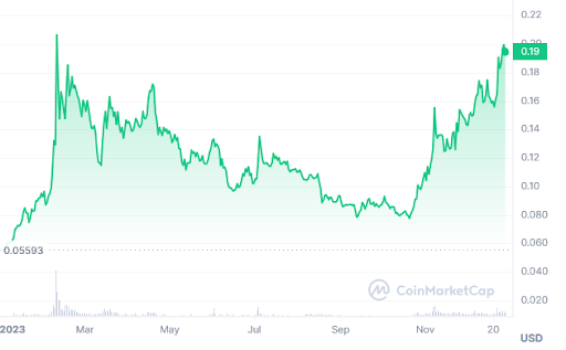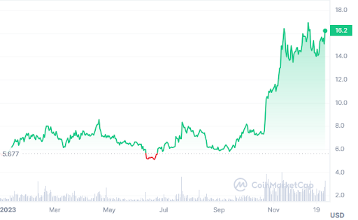 Chainlink cresceu 11.79% este mês, encerrando 2023 com um enorme crescimento de 181%.