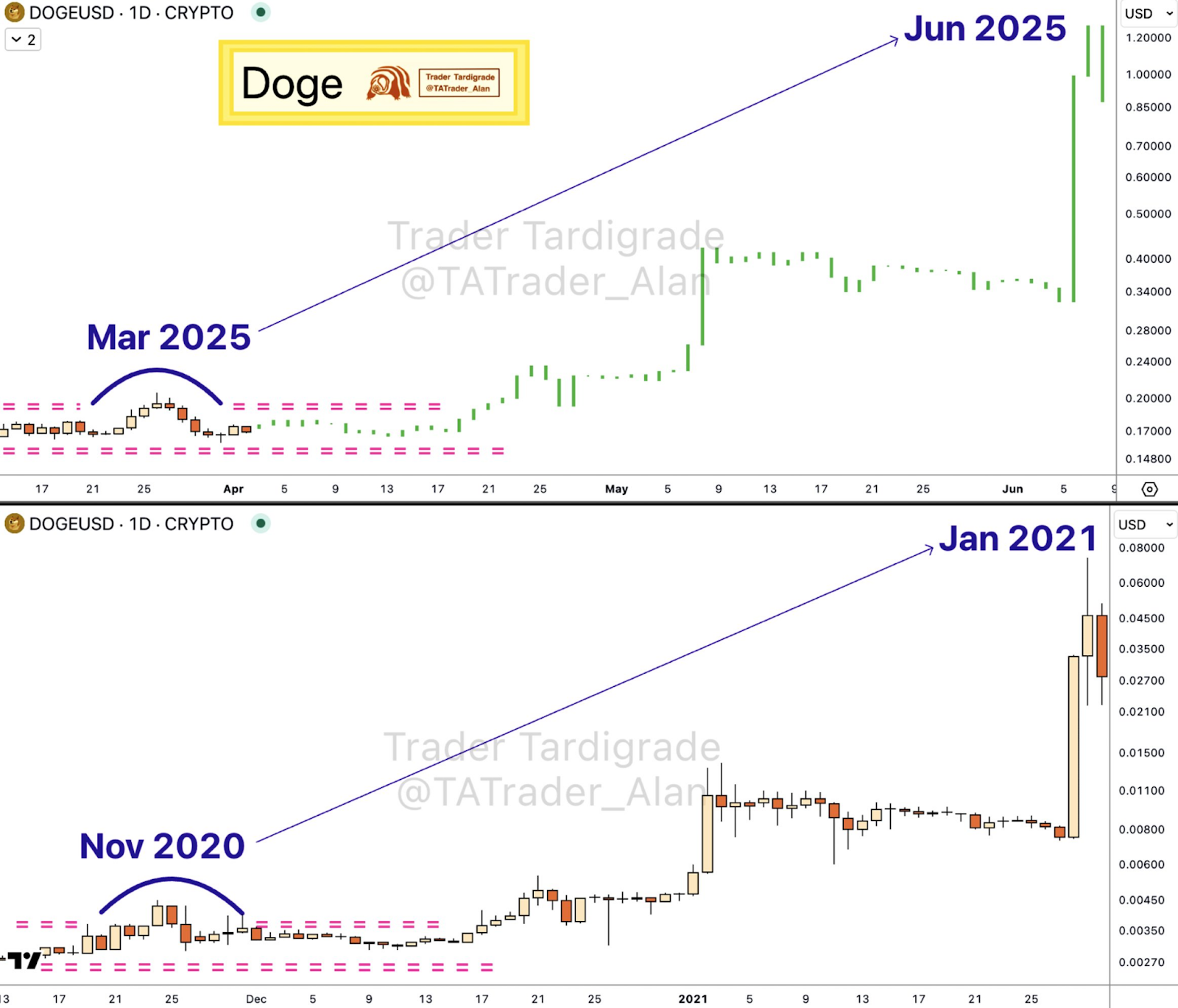 Dogecoin está mostrando um padrão antigo novamente. Analista @TATrader_Alan aponta para a mesma configuração que DOGE tinha em 2020 antes de dar um grande salto. O preço do Dogecoin agora é $0,1643. Mas se o gráfico se repetir, DOGE poderia alcançar $1,3. Antes disso, os níveis-chave de resistência são $0,25 e $0,70. Cada um destes precisará ser quebrado um por um.