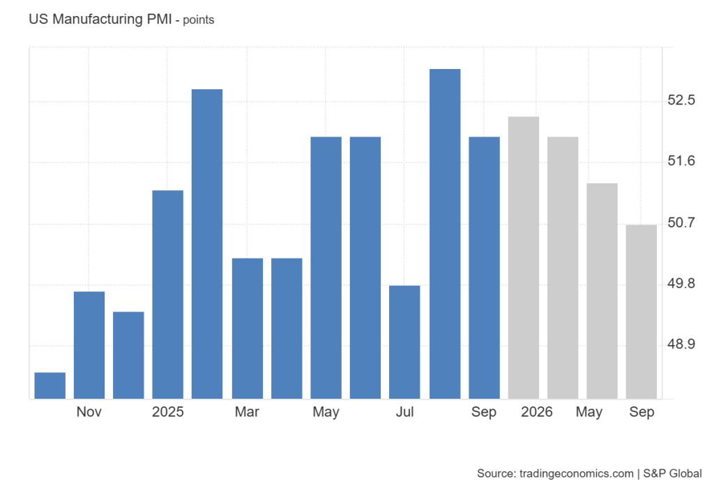 O ISM Manufacturing Index: Por outro lado, registrou 49.1% em setembro de 2025, apontando para uma contração da atividade. Diferente do PMI da S&P, o ISM tem maior peso nas percepções empresariais tradicionais e é amplamente seguido por formuladores de política monetária. Uma leitura abaixo de 50 significa que, para muitas empresas, a atividade industrial já se encontra em território negativo.