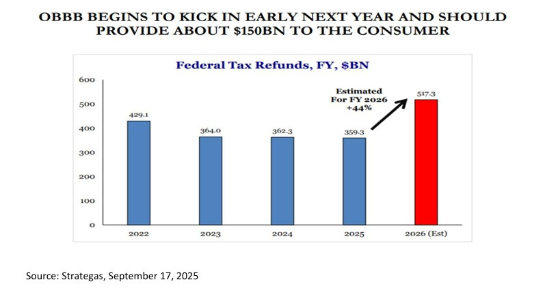 É nesse contexto que o OBBB emerge como catalisador de curto prazo. Do lado das famílias, a lei amplia o crédito tributário infantil, eleva a dedução padrão, ajusta limites de deduções SALT e cria isenções inéditas para gorjetas (até US$25 mil), e horas extras (até US$12.500). Segundo modelo da Strategas, tais medidas podem injetar cerca de US$150 bilhões nos bolsos das famílias a partir do primeiro trimestre de 2026, o que pode refletir uma forte propensão ao consumo.