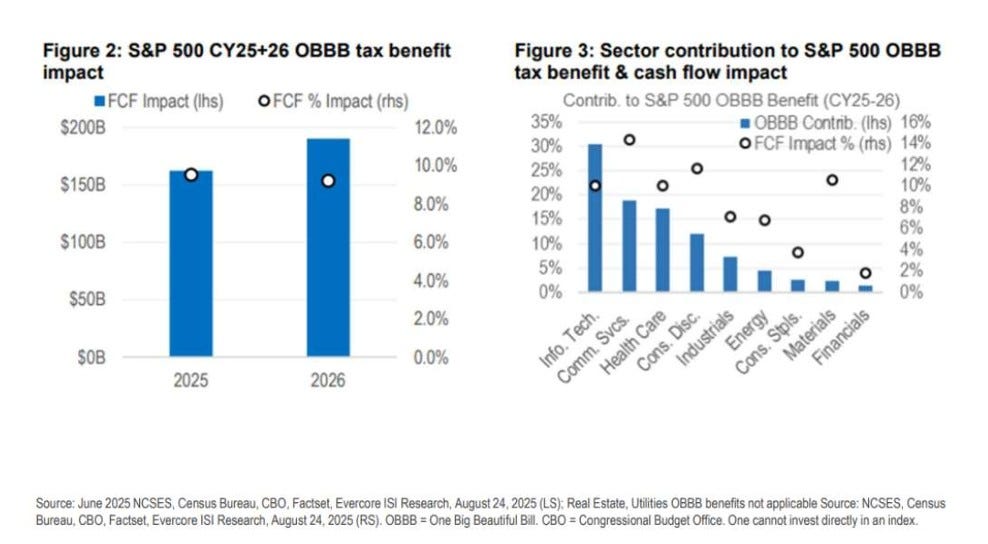 Do lado corporativo, o OBBB também reforça o ciclo de lucros. Embora mantenha a alíquota estatutária de imposto de 21%, a lei torna permanentes medidas da TCJA de 2017, como a depreciação acelerada, a dedução integral de P&D e de juros, que reduzem a base tributável. Na prática, isso pode levar muitas empresas a uma alíquota efetiva próxima de 10%. Em relatório recente, a consultoria Evercore ISI calcula que essas provisões aumentem o fluxo de caixa livre do S&P 500, em US$162 bilhões em 2025 (+9,5%) e US$190 bilhões em 2026 (+9,2%).