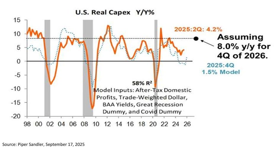 Esse ciclo é amplificado por incentivos fiscais extraordinários. O OBBB garante dedução integral para equipamentos, software, pesquisa e estruturas de manufatura até 2031, aumentando o retorno líquido do investimento. A queda dos juros reduz o custo de capital, e o reshoring, apoiado pela estratégia das tarifas e concessão de benefícios tributários, atrai fabricantes de volta ao território americano. Não por acaso, analistas da Piper Sandler projetam crescimento anual de 8% no capex até 2026, após alta de 4,2% no último trimestre.