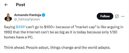 Armando Pantoja e outros analistas sugeriram recentemente que o XRP poderia alcançar $100, $300 ou $500. No entanto, esses alvos apresentam desafios significativos, dado o suprimento circulante atual de 57,1 bilhões de XRP e a dinâmica mais ampla do mercado.