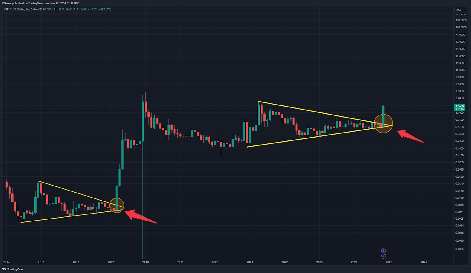 XRP está seguindo uma estrutura de gráfico que muitos especialistas dizem parecer com o que aconteceu em 2017. Uma quebra de um triângulo já aconteceu. Esta mesma forma no gráfico levou a uma forte alta anos atrás. Agora, o detentor @Kev_Capital_TA diz que o XRP está “repetindo a história”.