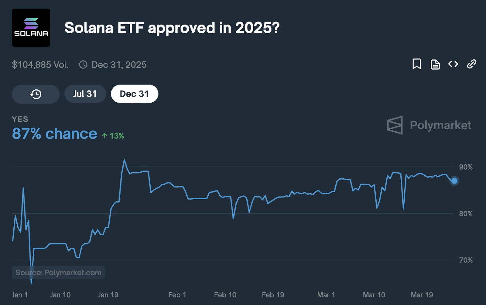 Notícias positivas, incluindo o lançamento de futuros da Solana pelo CME Group em 17 de março e o registro de um ETF spot da Solana pela Franklin Templeton, apoiam ainda mais isso. Além disso, os usuários do Polymarket preveem uma chance de 87% de aprovação do ETF este ano, gerando otimismo.