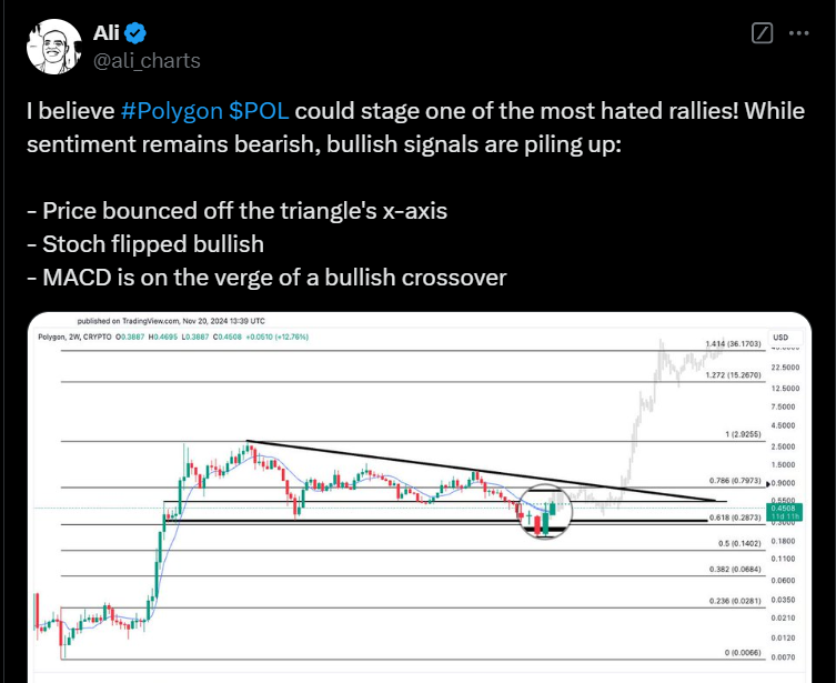 Apesar destes contratempos, alguns participantes de Polygon mantinham esperança em uma alta significativa baseada na previsão de Ali Martinez de que POL poderia subir de $0.4818 para $36. No entanto, semanas se passaram desde esta projeção, e o preço de POL continua em queda, levando muitos a reconsiderarem suas posições.
