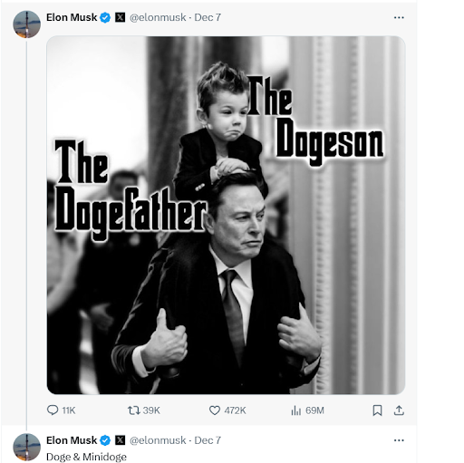 O aumento foi impulsionado principalmente por um post de Elon Musk no X (anteriormente Twitter), no qual ele compartilhou uma imagem de si mesmo carregando uma criança rotulada como “Dogeson”, com as palavras “Dogefather” e “MiniDOGE” anexadas. O post foi amplamente interpretado como um apoio de Musk ao BabyDOGE, causando um efeito dominó em toda a comunidade cripto.