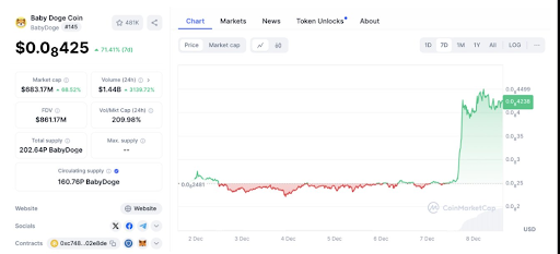 O volume de BabyDOGE disparou de pouco menos de $45 milhões para $1,44 bilhões em um período de 24 horas, levando-o para o topo dos rankings de volume diário.