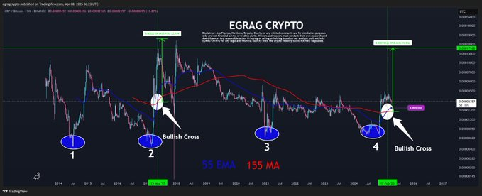 Uma análise recente de Egrag crypto gerou novo entusiasmo em torno do futuro do XRP. De acordo com Egrag, um indicador técnico chave—o Cruzamento de Alta—ocorreu recentemente em 17 de fevereiro de 2025, marcando um ponto significativo no par XRP/BTC. A última vez que isso ocorreu foi em 15 de maio de 2017, o que levou a uma impressionante alta de preço de 958% para o XRP.