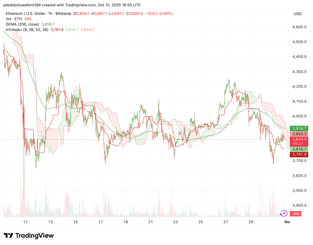 O Ethereum (ETH) está sendo negociado a US$ 3.844, e traders observam se o preço encontrará suporte em torno de US$ 3.700.