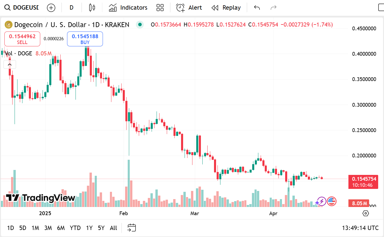 Além do ADA, Dogecoin também está atraindo a atenção dos investidores. DOGE caiu 2,27% para $0,1543, mas o volume de negociação de 24 horas subiu 7,3% para $544,24 milhões, refletindo maior atividade de mercado e ressurgente otimismo.