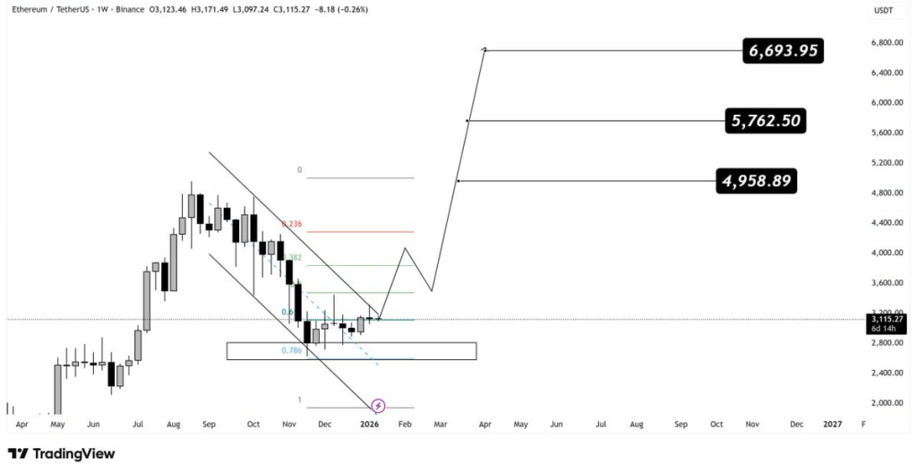 Os sinais técnicos estão se alinhando. O analista Marzell destaca que o ETH reagiu a partir do nível 0,786 de Fibonacci, ao mesmo tempo em que rompeu um padrão de cunha descendente — uma configuração que geralmente favorece a continuidade da alta.