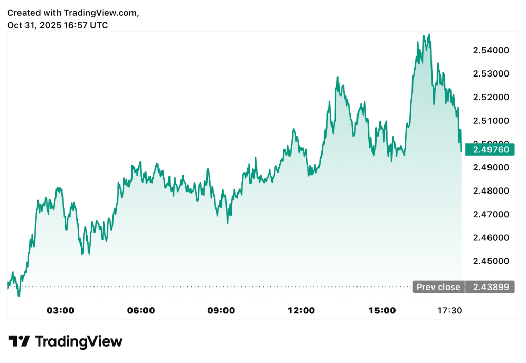 O XRP está sendo negociado próximo a US$ 2,40, recuperando-se gradualmente da correção de outubro.