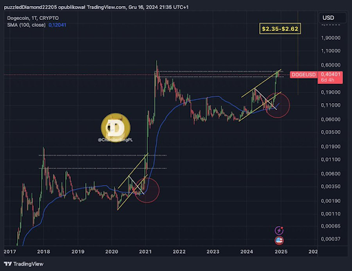 Especialistas ressaltaram a crescente impaciência entre os detentores de DOGE, pois o preço tem se mantido entre 0,35 USDT e 0,40 USDT por quase um mês. Contudo, os analistas também notaram que um padrão de “copo e alça” está se formando no gráfico semanal do DOGE, sugerindo que a criptomoeda pode romper os níveis de resistência e alcançar novos picos.