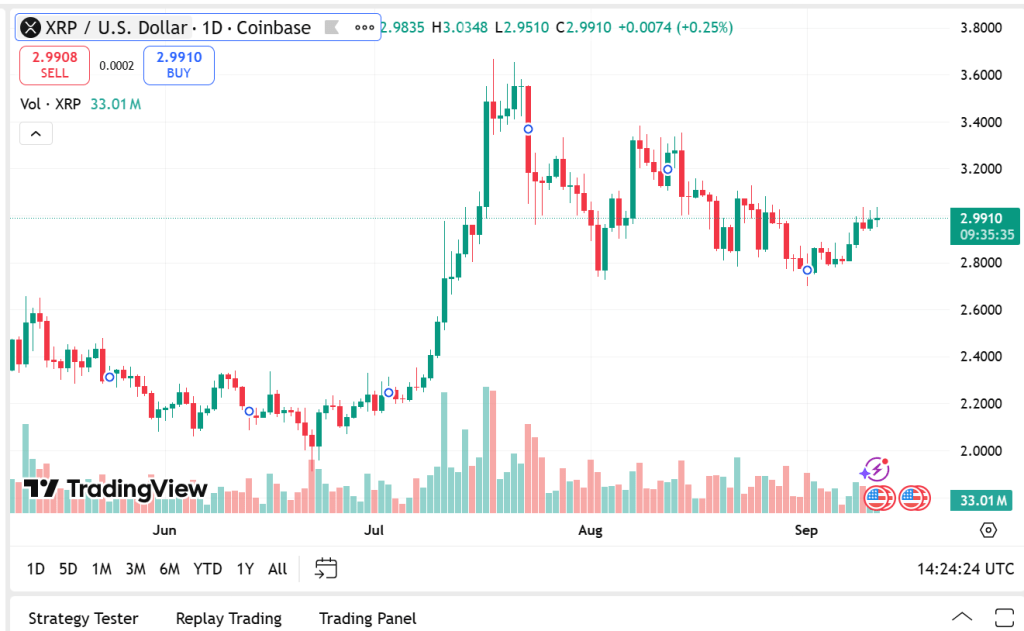 A Previsão de Preço XRP hoje está altamente correlacionada com atividade geral do mercado, com XRP negociando a $2.99 após uma perda de 0.67% nas últimas 24 horas. Apesar de sofrer um mergulho temporário, Ripple tem uma capitalização de mercado sólida de $178.51 bilhões, devido a um volume robusto de $4.98 bilhões negociados.