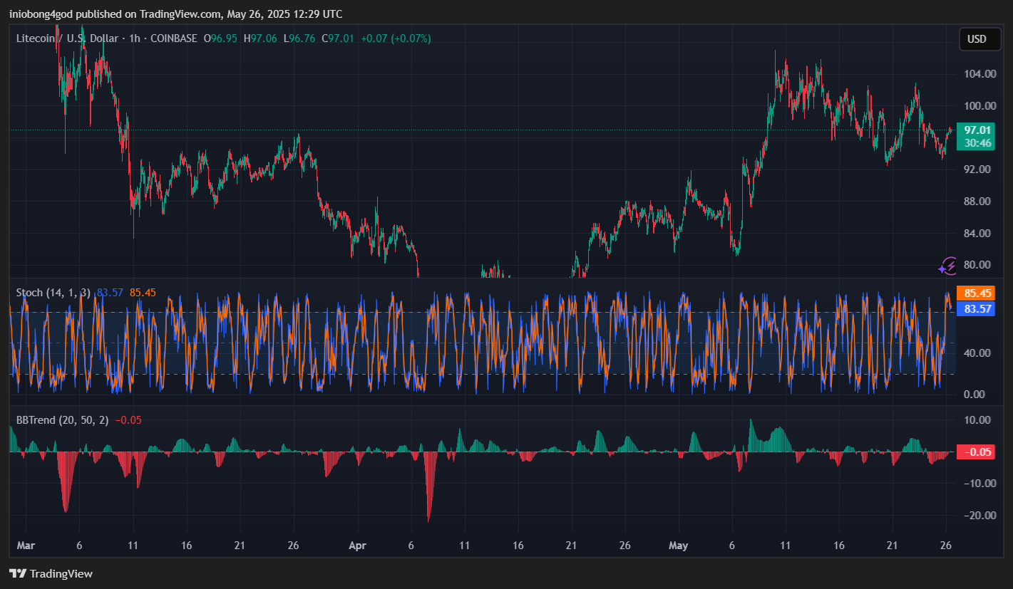 O preço do Litecoin está em $97 após se recuperar mais de 13% no mês passado. Conforme o gráfico do TradingView, Litecoin experimentou tendências tanto altas quanto baixas nos últimos 3 meses. Caiu para $78 durante este período antes de se recuperar para a faixa de $90.