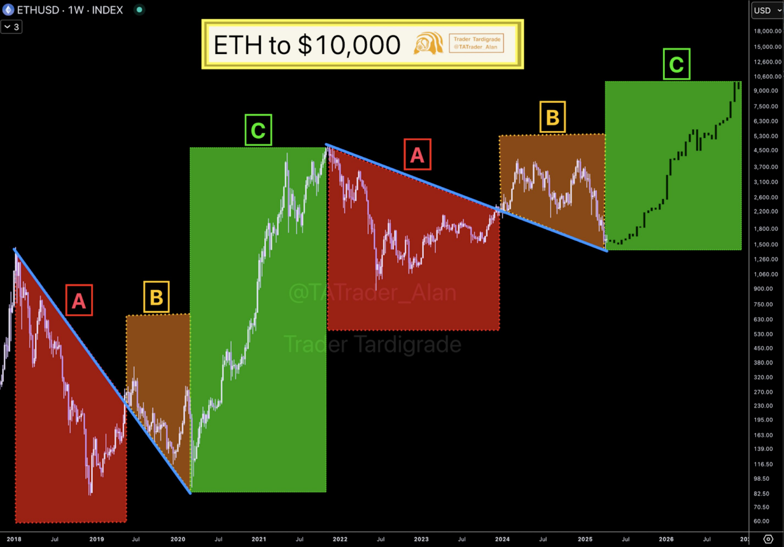 Ethereum está agora com preço de $1.583,06. Caiu 3,26% na semana passada. Mas isso não significa que está desmoronando. Trader Tardigrade diz que ETH está entrando na “Fase C.” Este é o último estágio em um padrão de gráfico comum. Frequentemente leva a um forte salto no preço. Seu alvo? Um grande movimento para cima até $10.000. Ele também diz que este poderia ser o impulso mais forte desde 2022.