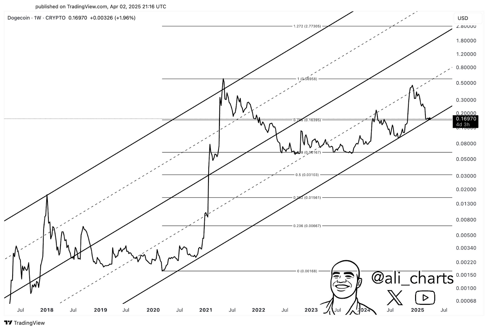 Um gráfico compartilhado por detentores mostra DOGE formando uma configuração em forma de J no prazo mensal. A última vez que isso ocorreu foi em 2017, antes de um forte aumento. O movimento atual abaixo de 0,21 USDT sugere que acumuladores anteriores estão mantendo valor não realizado.