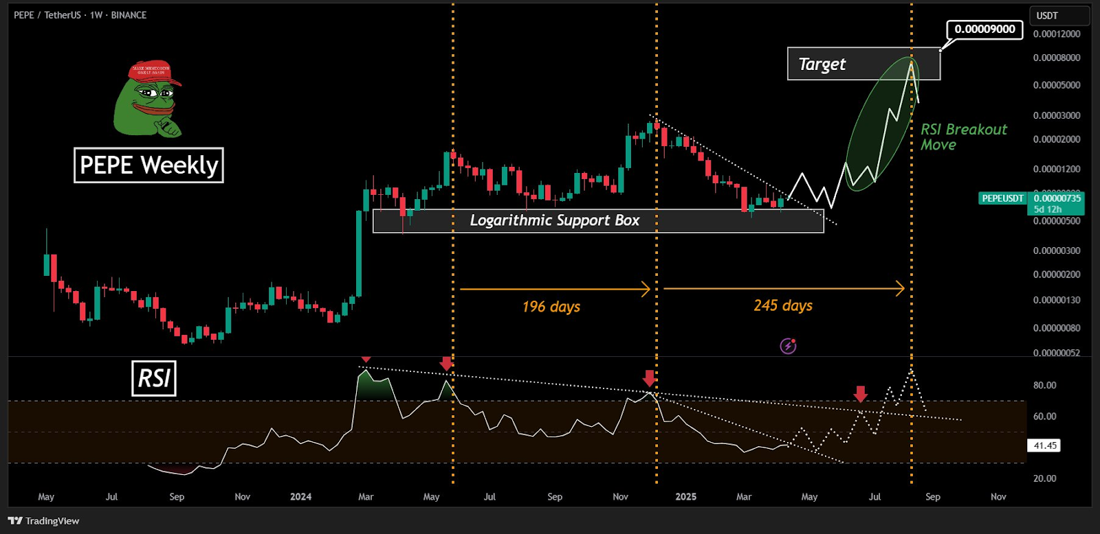 Para colocar em perspectiva, o especialista de mercado Bitcoinsensus destacou os próximos planos do PEPE em meio ao momentum renovado no período de tempo mais longo. Em um comentário recente, ele compartilhou que uma possível ruptura técnica e do índice de força relativa (RSI) poderia empurrar a memecoin para um novo máximo histórico.