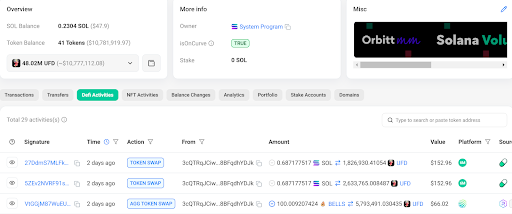 Curiosamente, ele começou a trocar seu saldo de Bellscoin (BELLS) por UFD quando acabou o Solana para comprar mais. Ao todo, a carteira comprou 48 milhões de UFD com $1.000, quando o token estava disponível por $0,00000674.