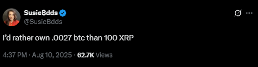 O debate sobre qual possui melhor potencial de alta, Bitcoin ou XRP, ressurgiu quando a Bitcoiner “SusieBdds” fez novas alegações sobre qual ela manteria. A ex-dentista, que alegou que ela e seu marido se aposentaram com Bitcoin, revelou que preferiria manter 0.0027 BTC do que 100 XRP inteiros.